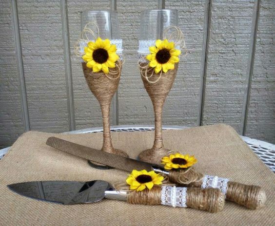 🥂 Διακοσμημένα ποτήρια σαμπάνιας – Τυλιγμένα με σπάγκο για ένα φυσικό αποτέλεσμα, διακοσμημένα με δαντέλα και ηλιοτρόπια για ρομαντική και φωτεινή πινελιά.