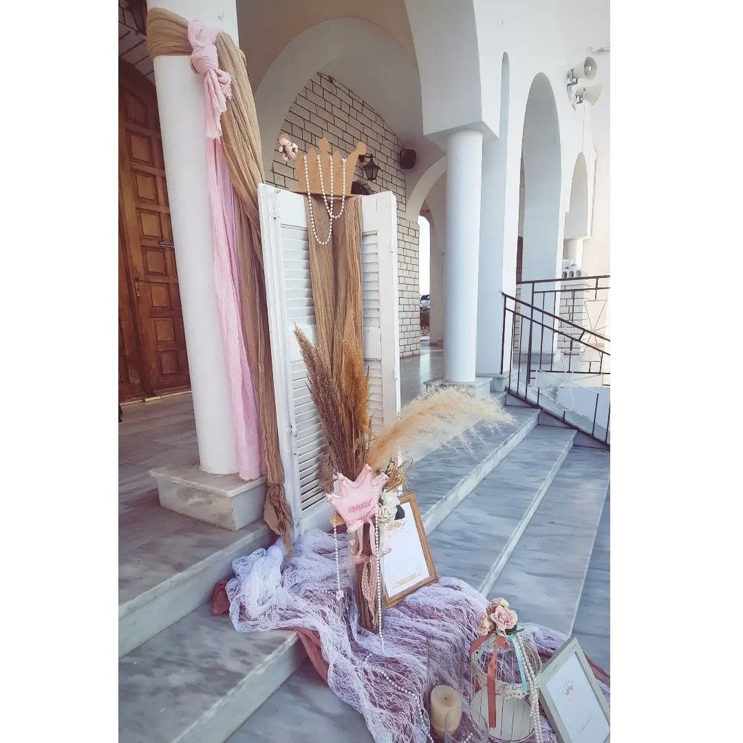 Ρομαντικός Στολισμός Εισόδου Εκκλησίας για Βάπτιση με Θέμα την Κορώνα