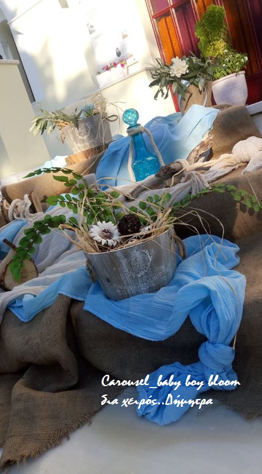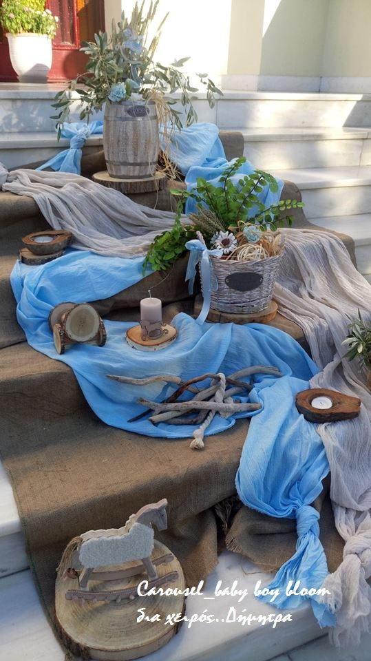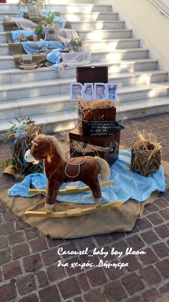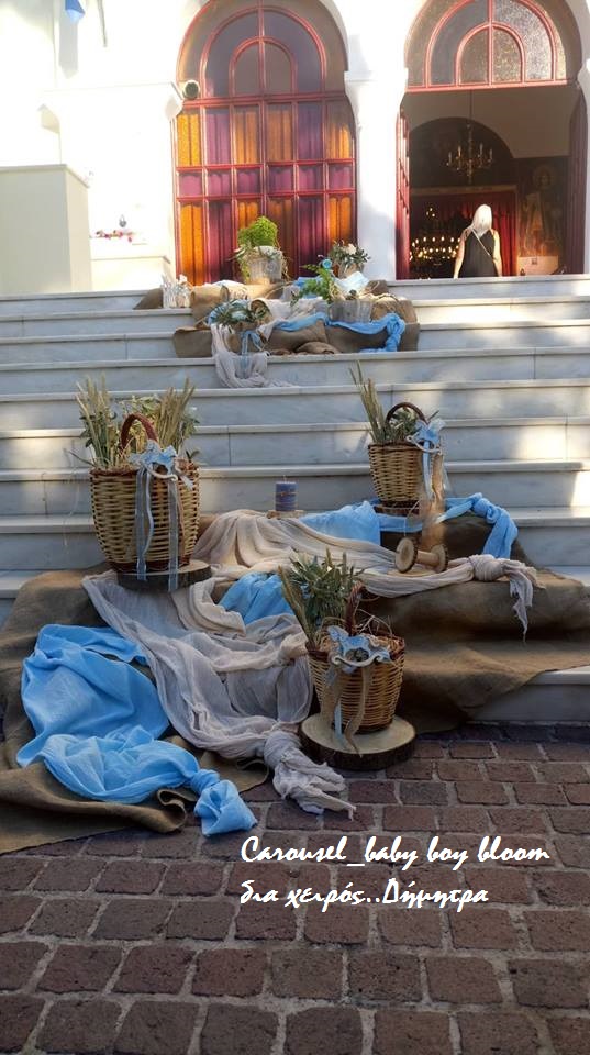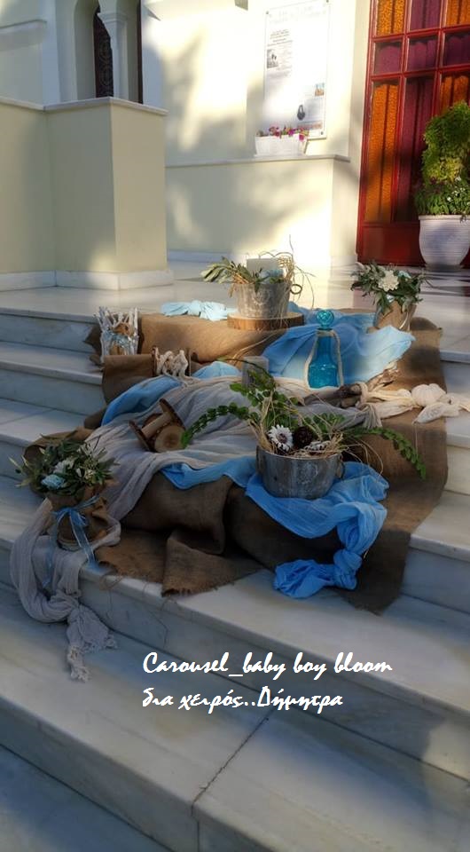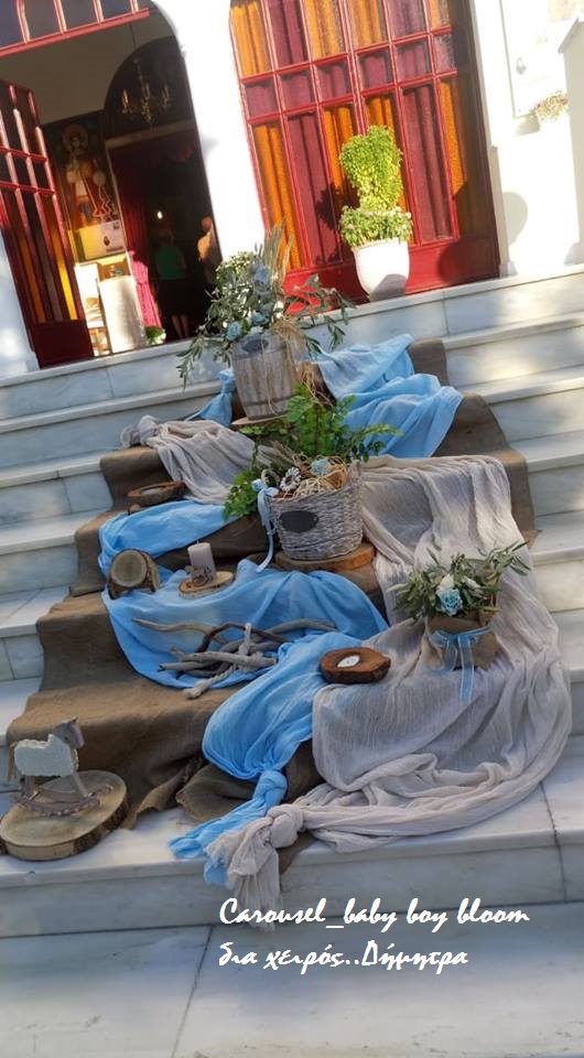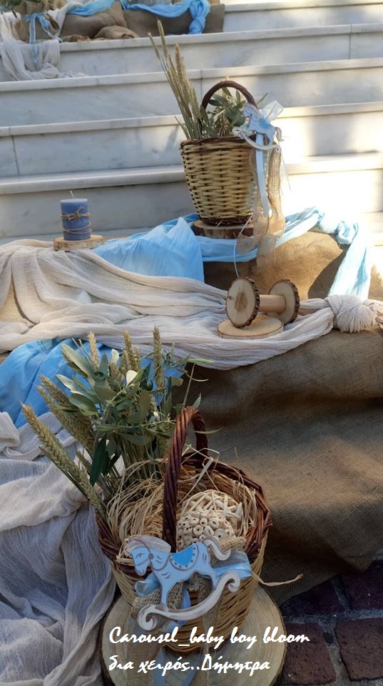 Η εικόνα αποτυπώνει τη διακόσμηση βάπτισης σε προαύλιο εκκλησίας με θέμα το καρουζέλ και αποχρώσεις του γαλάζιου και του μπεζ. Σκαλιστά ξύλινα αλογάκια, ψάθινα καλάθια, υφασμάτινες λεπτομέρειες και δεμάτια από άχυρο δημιουργούν μια ρομαντική και παραμυθένια ατμόσφαιρα. Η είσοδος του ναού είναι στολισμένη με φυσικά υλικά, λουλούδια και vintage διακοσμητικά στοιχεία, προσδίδοντας μοναδική φινέτσα στην τελετή.