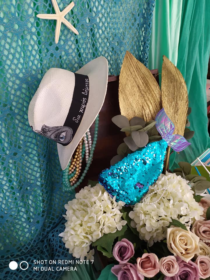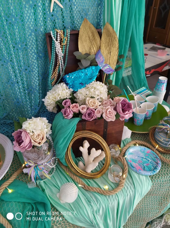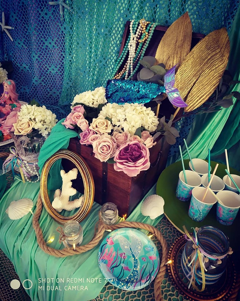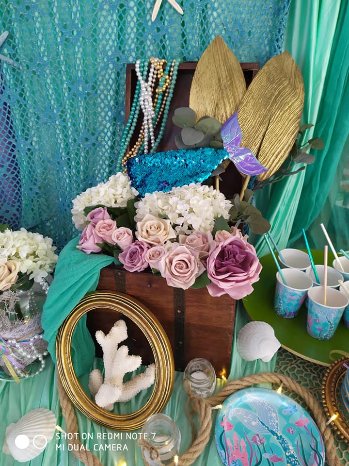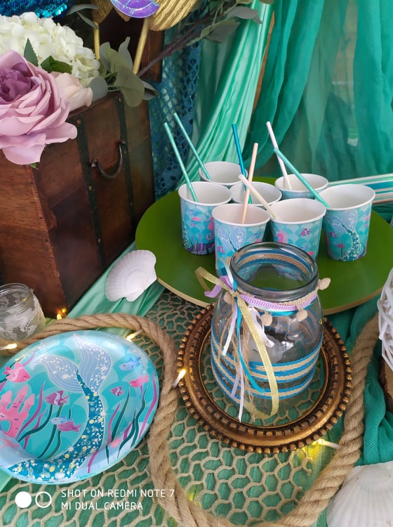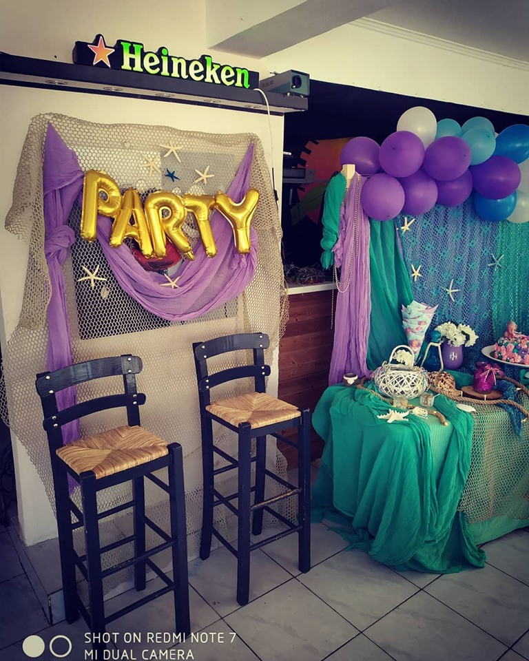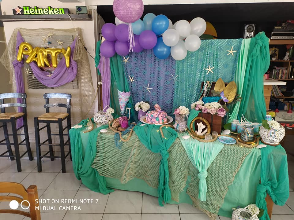 Μπαλόνια στα ίδια χρώματα στολίζουν το τραπέζι με τα κεράσματα . Ποτηράκια και πιατάκια στο θέμα της γοργόνας για τα κεράσματα των μικρών σας καλεσμένων . Διάφορες λεπτομέρειες, όπως κοχύλια, αστερίες, κοράλλια, πέρλες και κεριά σε γυάλινες βάσεις και boho ανθοσυνθέσεις με pampas grass και foam τριαντάφυλλα συμπληρώνουν τη διακόσμηση, δημιουργώντας ένα μαγευτικό σκηνικό.