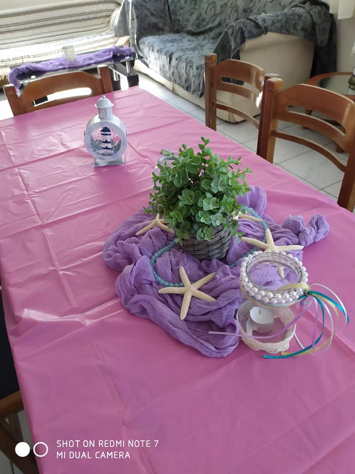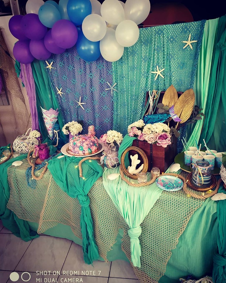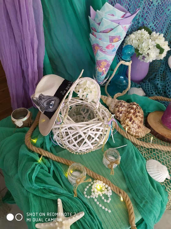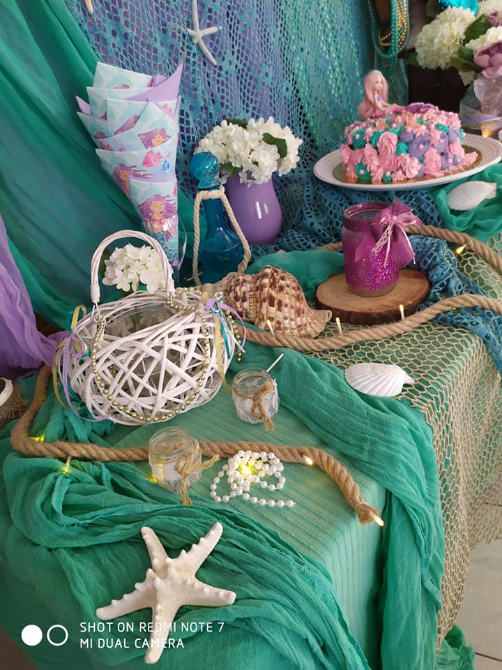 Η εικόνα παρουσιάζει έναν εντυπωσιακό στολισμό candy bar με θέμα την γοργόνα για κοριτσάκι σε εσωτερικό χώρο σπιτιού, ιδανικό για γενέθλια ή άλλη εκδήλωση. Κυριαρχούν ρομαντικές αποχρώσεις του λιλά του ρόζ και της μέντας με αέρινες υφές και δίχτυ που προσδίδουν μια θαλασσινή και άκρως καλοκαιρινή ατμόσφαιρα.