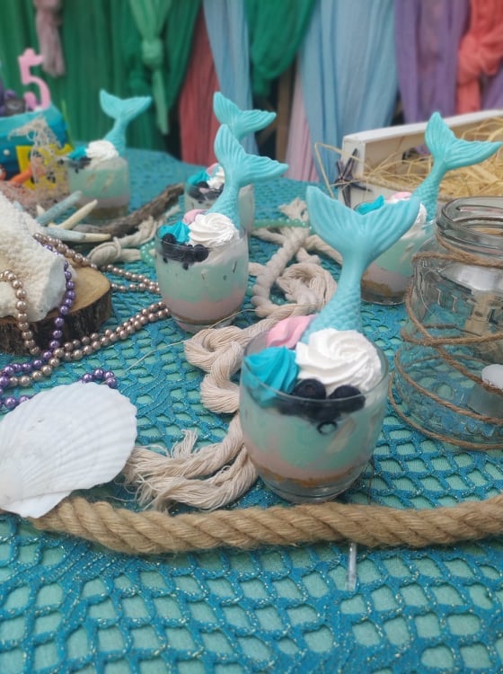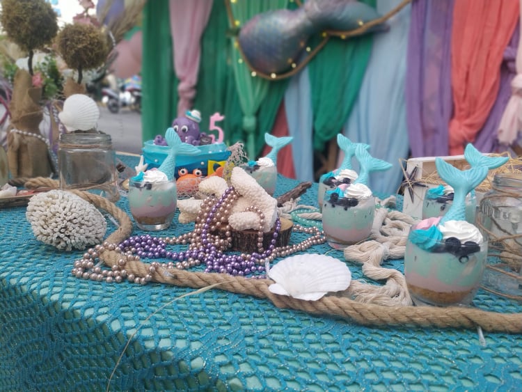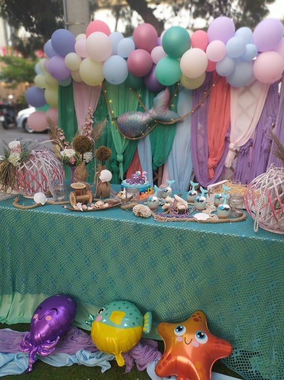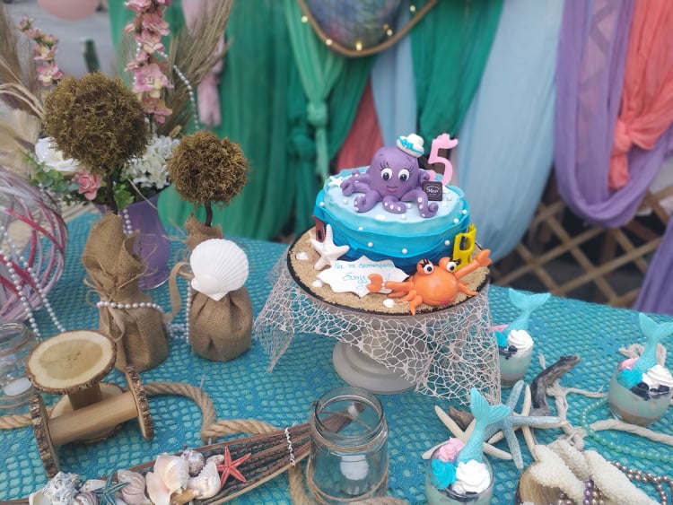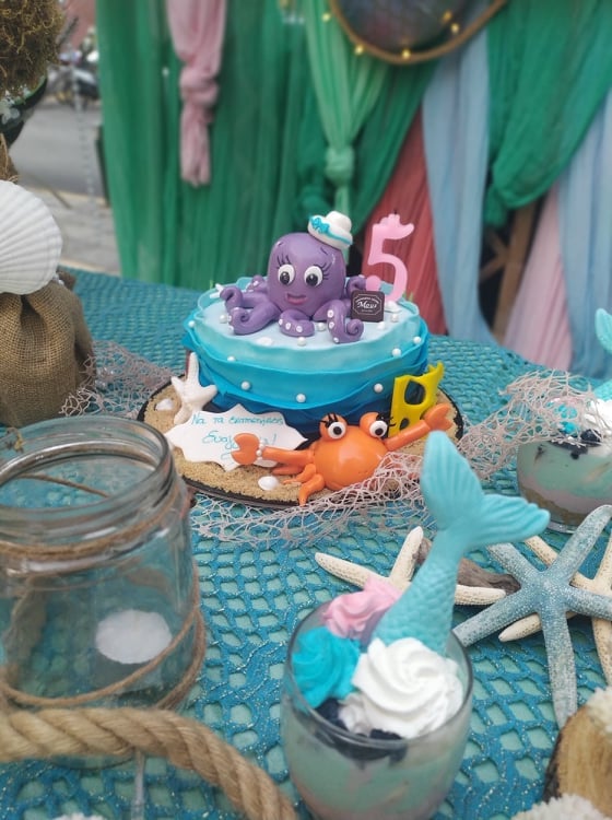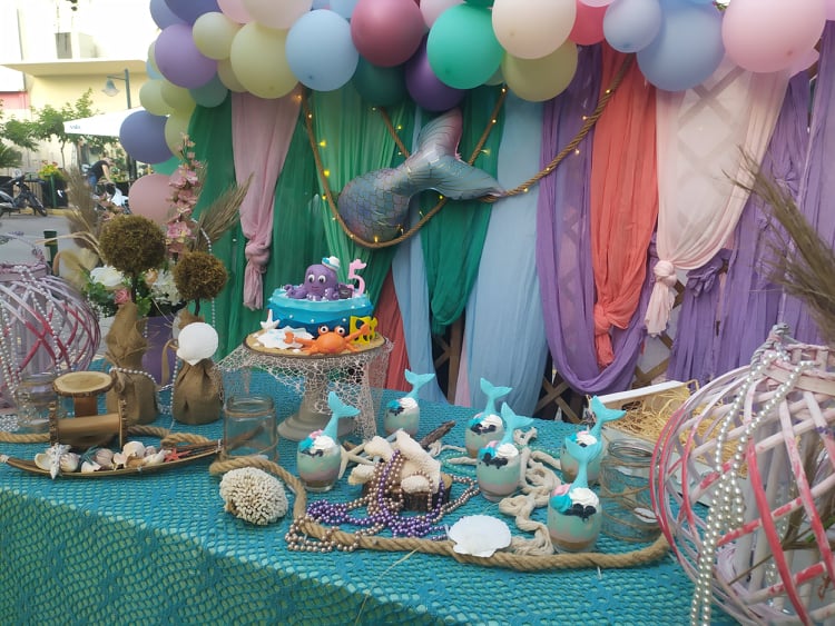 Μπαλόνια σε σχέδια αστερία , ουρά γοργόνας, χταποδιού και ψαριού στα ίδια χρώματα στολίζουν τα τραπέζια με τα κεράσματα . Διάφορες λεπτομέρειες, όπως κοχύλια, αστερίες, κοράλλια, πέρλες και ξύλινα διακοσμητικά στοιχεία με boho ανθοσυνθέσεις με pampas grass και foam τριαντάφυλλα συμπληρώνουν τη διακόσμηση, δημιουργώντας ένα μαγευτικό σκηνικό.