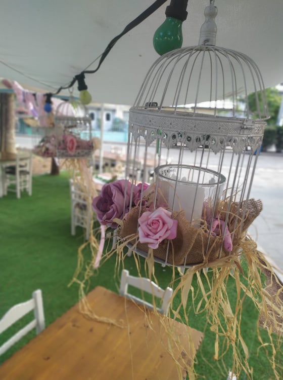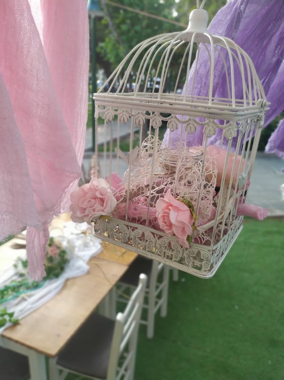 Στολισμός των τραπεζιών με συνθέσεις από μεταλλικά κλουβιά με αφρόξυλα ρόζ , foam τριαντάφυλλα και raffia και αέρινες γάζες του ροζ και του λιλά.