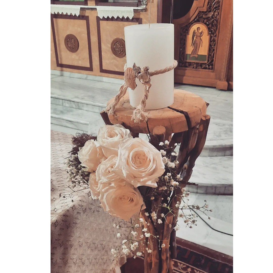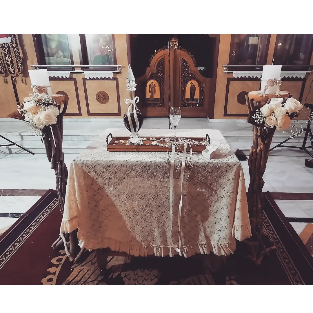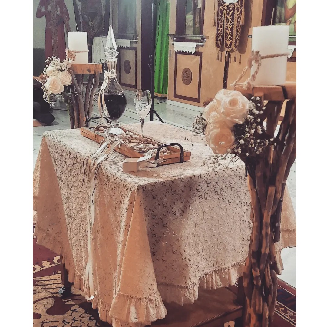 Προσθέστε μια αίσθηση ρομαντισμού και κομψότητας στην πιο ξεχωριστή σας στιγμή με αυτόν τον προσεγμένο στολισμό γάμου. Η ξύλινη διακόσμηση, οι περίτεχνοι χειροποίητοι κηροστάτες και το διακοσμημένο τραπέζι με δαντέλα και φυσικά άνθη δημιουργούν ένα ζεστό και εκλεπτυσμένο σκηνικό. Κάθε λεπτομέρεια είναι προσεγμένη για να αποπνέει ρουστίκ φινέτσα και διαχρονική αισθητική.