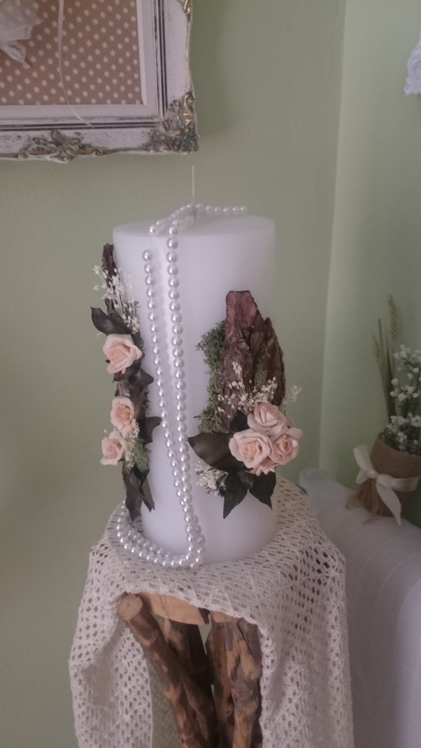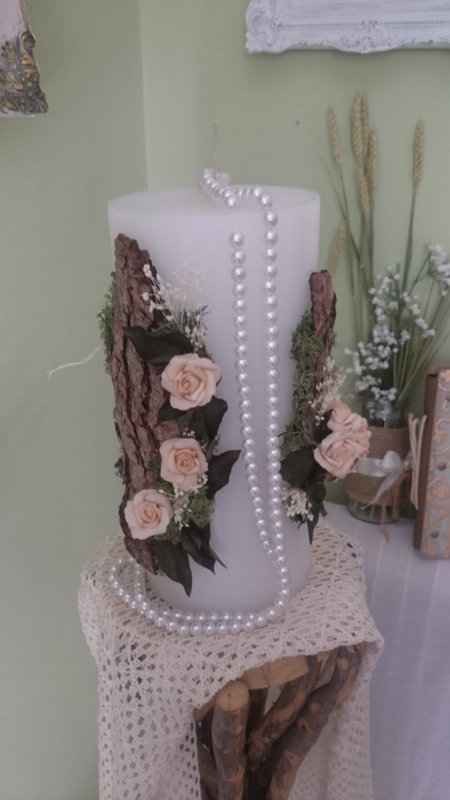 Κυλινδρική λαμπάδα με ένα κομψό διακοσμητικό στοιχείο ιδανικό για γάμους ή διακόσμηση εσωτερικών χώρων. Είναι στολισμένη με αποξηραμένα και υφασμάτινα λουλούδια σε παστέλ αποχρώσεις, όπως ροζ τριαντάφυλλα, συνοδευόμενα από πλούσια φυλλώματα σε σκούρους και γήινους τόνους. Ένα μακρύ διακοσμητικό κολιέ από λευκές πέρλες προσδίδει πολυτέλεια και vintage αισθητική.