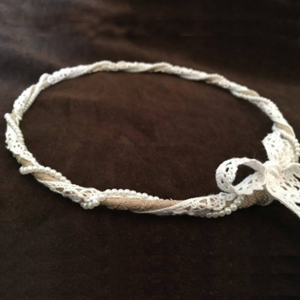 Χειροποίητα στέφανα γάμου με vintage αισθητική, φτιαγμένα από λινάτσα και δαντέλα σε αποχρώσεις του ιβουάρ και του μπεζ. Διαθέτει πλεκτές λεπτομέρειες και ένα διακριτικό φιόγκο από δαντέλα στο πλάι, προσδίδοντας ρομαντικό και παραδοσιακό χαρακτήρα. Ιδανικό για γάμους με rustic ή boho διακόσμηση.